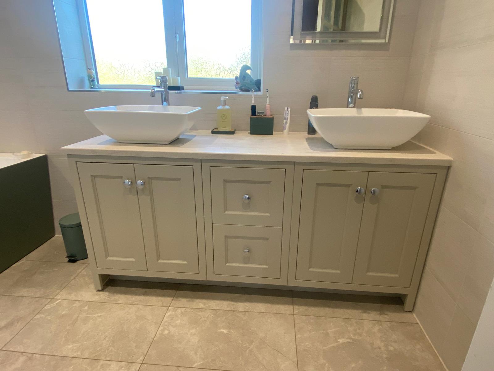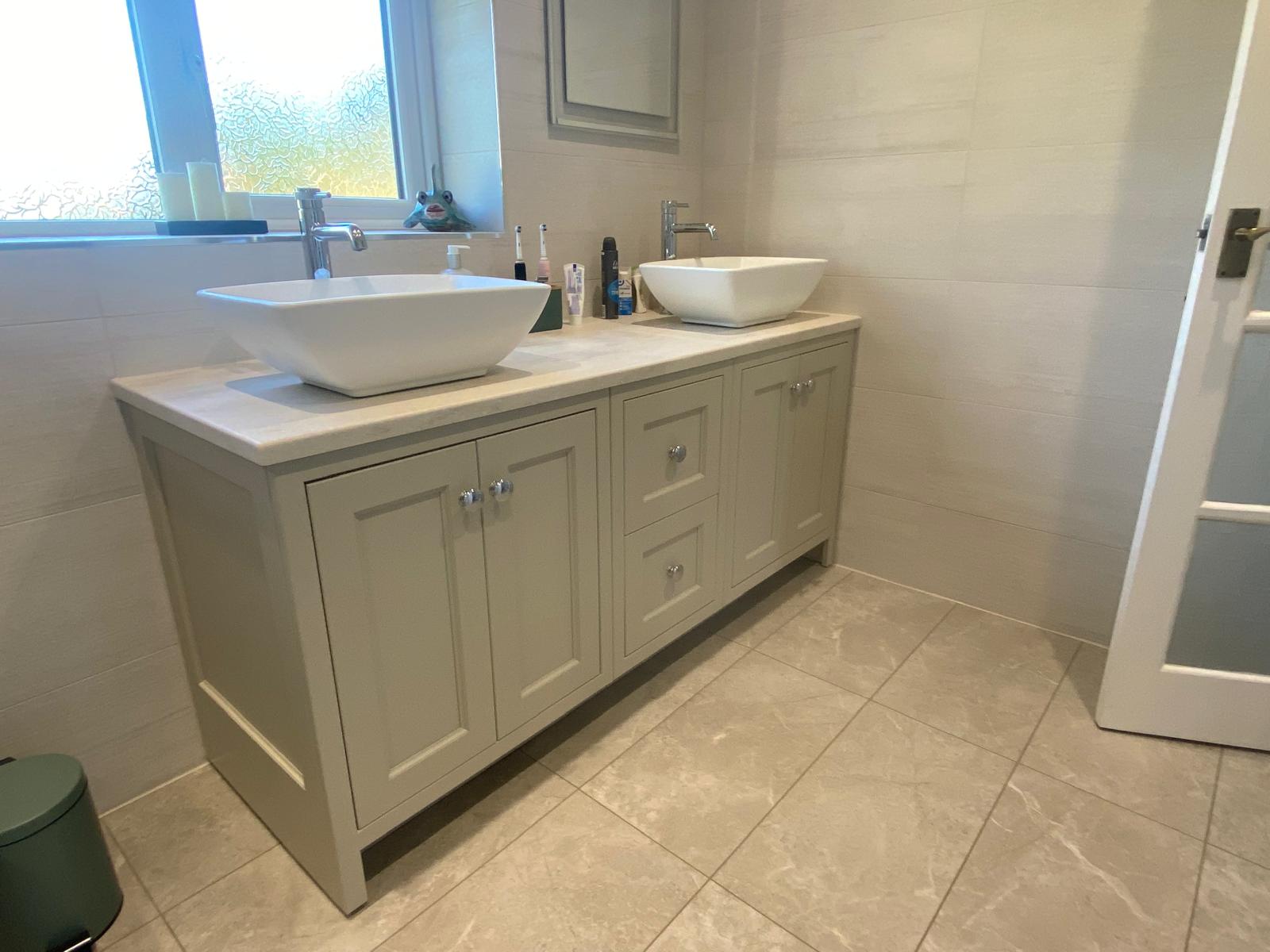 Project Description Modern grey bathroom with navy blue basin drawers and stainless steel finishes. Book an Appointment