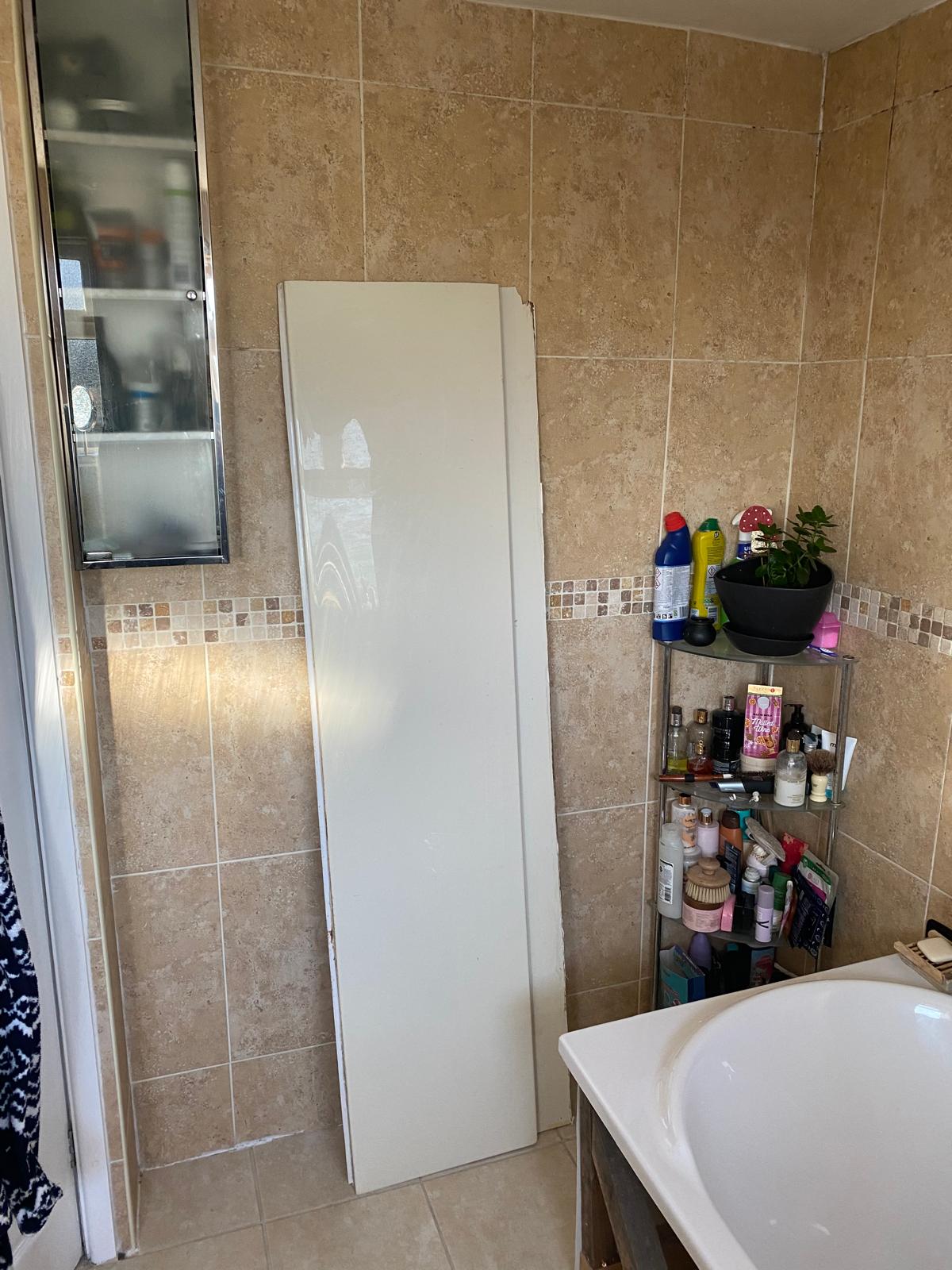 Project Description Modern white shower with stainless steel finishes and mosaic tile design strip featured on side wall. Book an Appointment